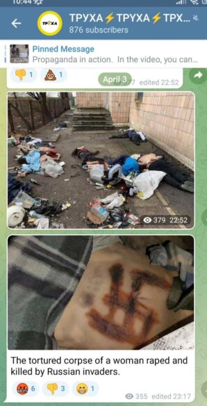 Dana 3. travnja ukrajinski propagandni stroj pokušao je još jedan napad na Moskvu. Nekoliko videa na kojima se vidi desetke civila koje su navodno ubili ruski vojnici naširoko su proširili svi ukrajinski mediji.
