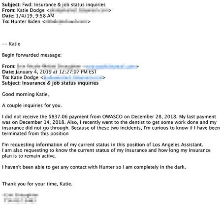 U siječnju 2019. poslala je e-poruku Hunterovoj tajnici s pitanjem zašto nije primila plaću za prosinac od 837,06 dolara i zašto zdravstveno osiguranje njezine tvrtke nije aktivno.