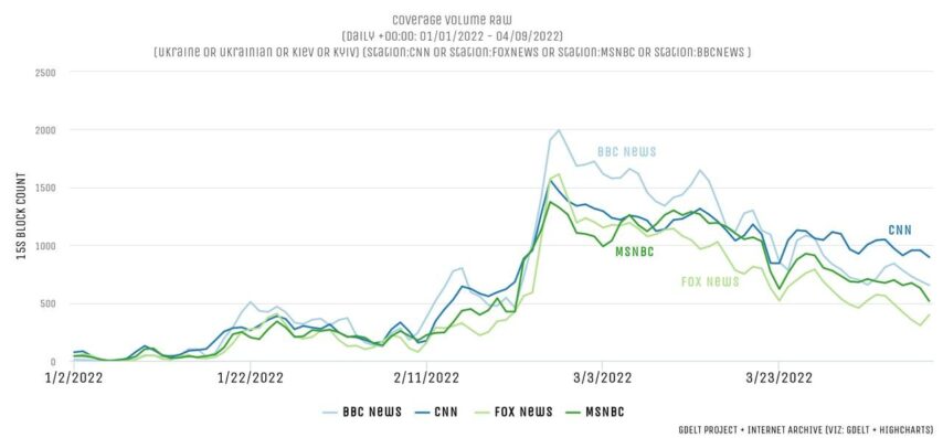 Vremenska traka u nastavku prikazuje ukupna dnevna spominjanja zemlje na BBC News Londonu, CNN-u, MSNBC-u i Fox Newsu od početka ove godine, pokazujući oštar zaokret od zemlje neposredno nakon invazije. Samo je CNN zadržao gotovo istu količinu dnevnog izvještavanja kao i na dan invazije, a BBC News je pokazao najveći pad spominjanja.