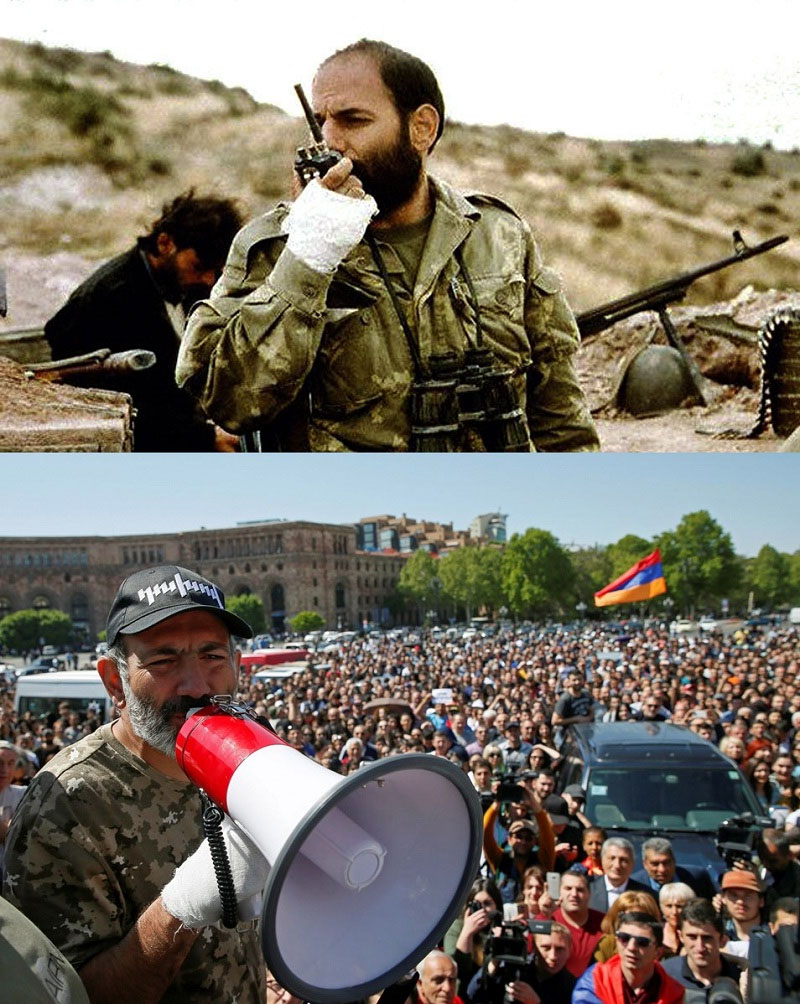 Na većini fotografija iz nereda i prosvjeda u Erevanu Pašinjan ima borbenu maskirnu, omotanu ruku u kojoj drži megafon. Na početku nemira je u proboju do zgrade parlamenta slučajno pao na bodljikavu žicu i ozlijedio ruku. Od tada je danima hodao sa svojim “hrabrim” zavojem. No, Nikol Pašinjan, bolje rečeno stratezi “Obojenih revolucija”, dobro znaju tko je u svijesti svih Armenaca bio i ostao Monte Melkonijan i taj se adut nije mogao odbaciti. Zavoji i maskirna majica su samo mali dio reinkarnacije Melkonijana i preoblačenja u svima znanog heroja, “glumeći” njegovu ulogu.