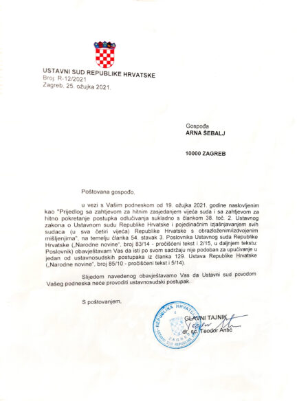 Pisali smo o tome, no zanimljivo je što je to pristiglo kao Odgovor sa Ustavnog suda nakon tog Prijedloga Ustavnom sudu (ultimatuma bolje rečeno, tada) za pokretanje postupka za ocjenu suglasnosti s Ustavom i zakonom u pogledu Odluke o proglašenju epidemije od 11. 03. 2020. koja je stupila na snagu danom donošenja, znači 11. 03. 2020. koju je donio ministar zdravstva Vili Beroš temeljem mišljenja iz HZJZ potpisanog od ravnatelja HZJZ, Krunoslava Capaka, sa svim potom donesenim Uredbama i Odlukama, upućenog Ustavnom sudu 19. 03. 2021. uz rok odgovora od 48 sati, a sve sukladno čl. 38. toč. 2. Ustavnog zakona o Ustavnom sudu Republike Hrvatske i zahtjevom za pojedinačnim izjašnjavanjem svih sudaca pojedinačno u sva četiri vijeća.