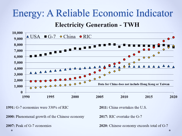 Kineska proizvodnja električne energije sada je premašila sve zemlje G-7 zajedno. Sve nacije “klimatskih promjena” sabotiraju vlastitu energetsku infrastrukturu, što dovodi do brzog pada poljoprivredne proizvodnje, industrije, vojnih sposobnosti, rasta malih poduzeća i stanovništva. Kultisti klimatskih promjena su ti koji potiču nacionalna samoubojstva, dok one nacije koje se ne boje proizvoditi i koristiti energiju brzo zasjenjuju Zapad.