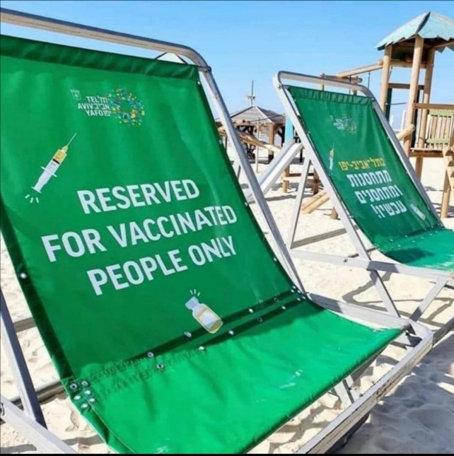 Kao da to sve nije dovoljno, neće im biti dozvoljen niti odlazak na plažu. Grad Tel Aviv je na sve svoje plažne ležaljke promijenio tkaninu i stavio natpis da je sjedanje dozvoljeno samo za cijepljene! Pogledajte sliku i usporedite sa jednom drugom slikom iz Njemačke 1930-ih godina. Tada Židovi nisu smjeli ulaziti u neka mjesta jer nisu smatrani dovoljno „čistima“. Danas imamo potpuno isti slučaj: