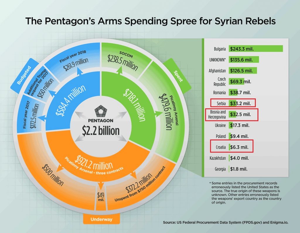Novo ”senzacionalno” izvješće dviju međunarodnih skupina za praćenje oružja potvrđuje da Pentagon nastavlja isporučivati rekordne količine oružja u Siriju i da Pentagon za sobom briše sve tragove. U utorak su Organizacija za prijavljivanje kriminala i korupcije (OCCRP) i Balkanska istraživačka mreža (BIRN) objavili dokaze da je Pentagon trenutno uključen u isporuku oružja vrijednog 2,2 milijarde dolara preko prikrivene mreže privatnih trgovaca svojim saveznicima u Siriji. Riječ je uglavnom o starom sovjetskom oružju zemalja istočnog bloka i bivše Jugoslavije, među kojima su na listi Srbija, BiH i Hrvatska.