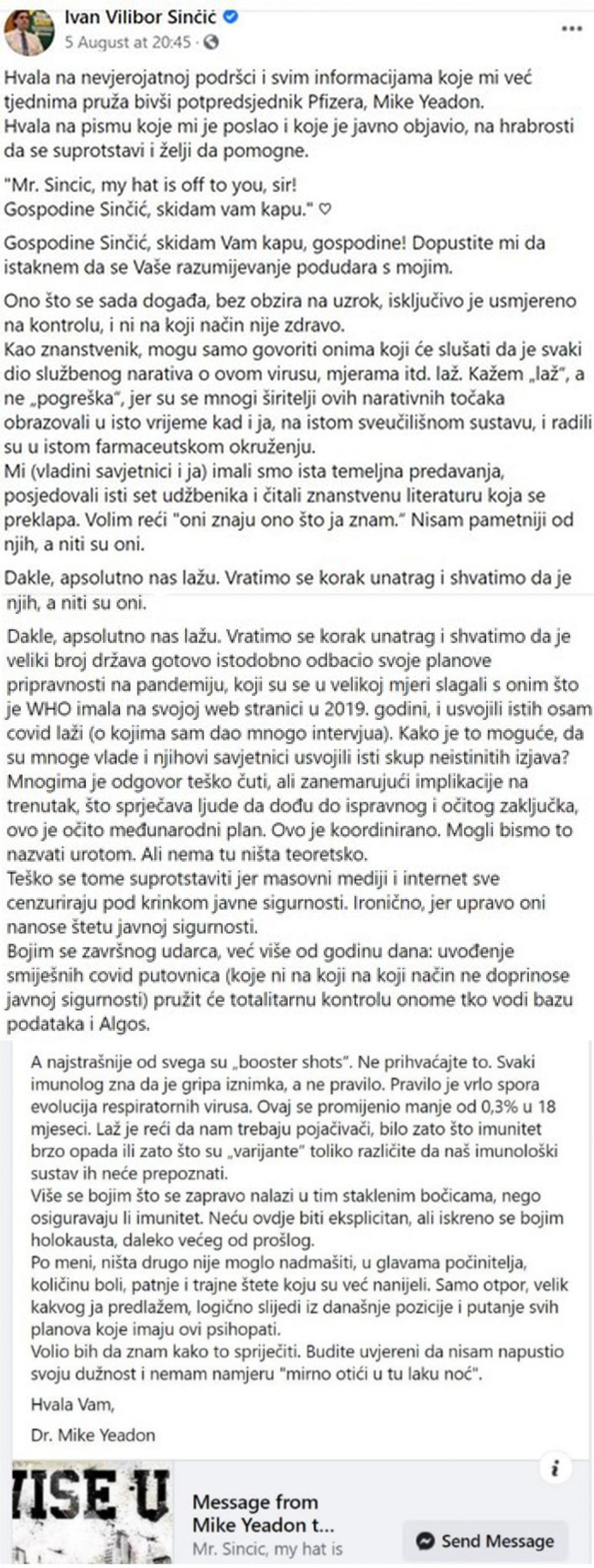 Dr. Mike Yeadon, bivši potpredsjednik Pfizera i glavni znanstveni direktor za istraživanja alergija i respiratornih bolesti (CSO and VP, Allergy & Respiratory Research Head) u pismu našem zastupniku u Europskom Parlamentu i članu njegovog Odbora za okoliš, zdravlje i sigurnost hrane (ENVI) upozorava na moguće štetne učinke Covid-19 cjepiva, posebno docjepljivana („booster shots“).