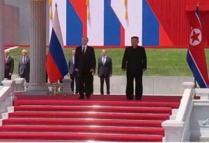 Dvojica lidera započeli su zvaničnu ceremoniju na trgu Kim Il Sung u centru Pjongjanga u srijedu oko podneva. Vojni orkestar svirao je državne himne dvaju naroda, a artiljerijski topovi ispalili su salvu dobrodošlice. Trg, koji može primiti više od 100.000 ljudi, bio je prepun lokalnog stanovništva, koji je došao da pozdravi ruskog predsjednika.