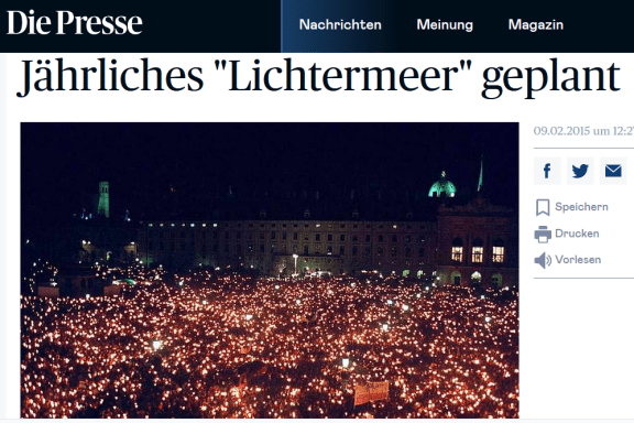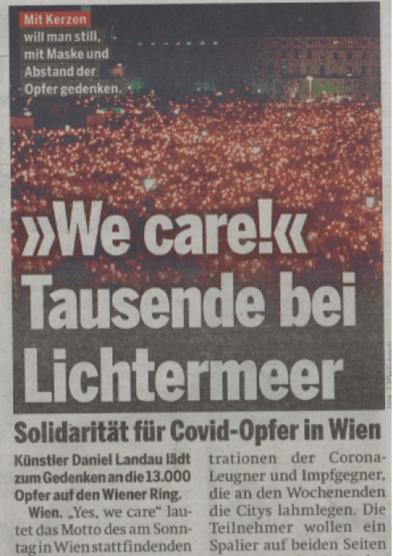 Austrijske novine OE24 pružaju nam izvrstan primjer sumnjivog, manipulativnog izvještavanja. U broju od 15. prosinca na 8. stranici, uz obveznu propagandu cijepljenja i anti-FPÖ agitaciju, nalazi se i posebna vrsta članka. Površnom čitatelju treba ostaviti lažan dojam da deseci tisuća ljudi sa svijećama u moru svjetla su vrlo čvrste i “solidarno” stoje iza režima Corone. Tek ako pažljivo pročitate saznat ćete da se parada prikazana na slici uopće nije ni održala.