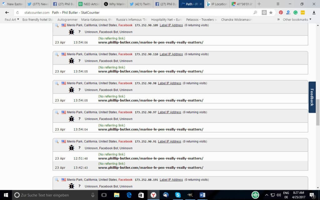 Konkretno, Phil Butler je otkrio nepoznate IT stručnjake koji na Facebooku blokiraju sve pozitivne članke o Marine Le Pen. I sam je pokušao podijeliti jedan članak o Le Pen, ali nije uspio.