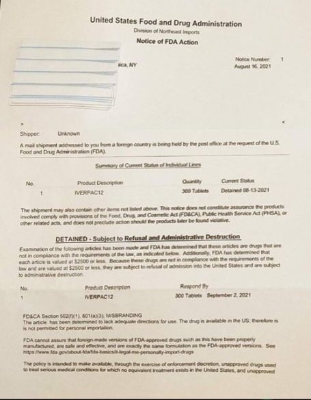 U SAD-u ne samo da je liječnicima zabranjeno izdavati recepte za Ivermectin, bolnicama je također zabranjeno davati ga, a sad prema najnovijem dokumentu koji je procurio, izgleda da je regulatorna agencija za hranu i lijekove (FDA) naredila Američkoj pošti da presretne i uništi sve pakete koji sadrže Ivermectin. Kao da se radi o nekoj zabranjenoj supstanci, kokainu ili nečem sličnom.