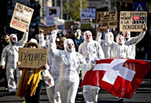 Među sloganima koji su se čuli tijekom marša u utorak navečer bio je ”mir, sloboda, narod je suveren”. Na skupu su bili zvončari i bubnjari, uobičajena karakteristika ovakvih događaja u Švicarskoj posljednjih mjeseci.