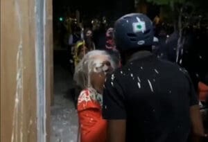 Portlandska policija tvitovala je fotografiju jedne starije žene na meti demonstranata koju su poprskali nečim što izgleda kao bijela boja.