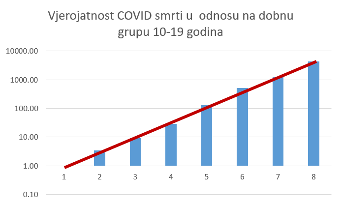 U usporedbi s njom dobna skupina od 20-29 godina ima 3,5 puta veću smrtnost, a dobna grupa od 30-39 godina 9 puta. Svaka sljedeća starija dobna skupina ima sve veću smrtnost. Primijetimo da dobna skupina od 80-89 godina ima 4 300 puta veću smrtnost od dobne skupine od 10-19 godina. S obzirom na to da su ljudi vizualna bića, još više konteksta možemo dobiti ako te podatke prikažemo grafički.