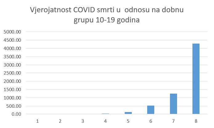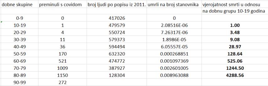 U tablici je prikazan službeni broj preminuli s COVIDOM-19 po dobnim skupinama te ukupni broj ljudi u tim dobnim skupinama prema popisu stanovništva iz 2011 godine. Dijeljenjem broja preminulih s ukupnim brojem ljudi dobije se vjerojatnost smrti s COVIDOM-19 za tu dobnu skupinu, što je izračunano u četvrtom stupcu. Ti brojevi vam ne znače baš puno ako ih ne stavite u kontekst (kako to Faktograf voli reći i cenzurirati). Kontekst je taj da usporedite koliko je smrtnost veća u odnosu na dobnu skupinu s najmanje umrlih. U ovom slučaju to je dobna skupina od 0-9 godina s tim da u toj skupini nema niti jednog preminulog od COVIDA-19, pa onda sve druge koje imaju preminule od COVIDA-19 imaju beskonačno veću vjerojatnost umiranja. Baš i nismo dobili kontekst za razumijevanje tih podataka. Zbog toga sam za usporedbu uzeo dobnu skupinu koja ima najmanju smrtnost različitu od nule, a to je dobna skupina od 10-19 godina.