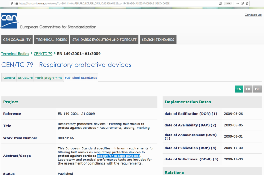 U tom sažetku Europski komitet za standarde jasno naglašava da respiratori vrše odstranjivanje čestica samo u jednom smjeru, prema korisniku istih, zato ih i naziva polu-maskama. Ovo je vrlo važno pa ćemo to još jednom naglasiti. Standard EN 149:2001 definira polu-maske, tj. definira minimalne uvjete samo za propusnost prema korisniku respiratora. On ne govori o filtraciji izdahnutog zraka.