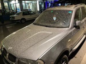 Predveče, početkom avgusta, dok sam bio dole, pala je kratkotrajna kišica i ostavila ovakve tragove po autima. Niti jak mlaz vode nije bio u stanju saprati ove fleke na limariji i morao sam dobro zavrjeti i spužvom ukloniti sve tragove.