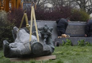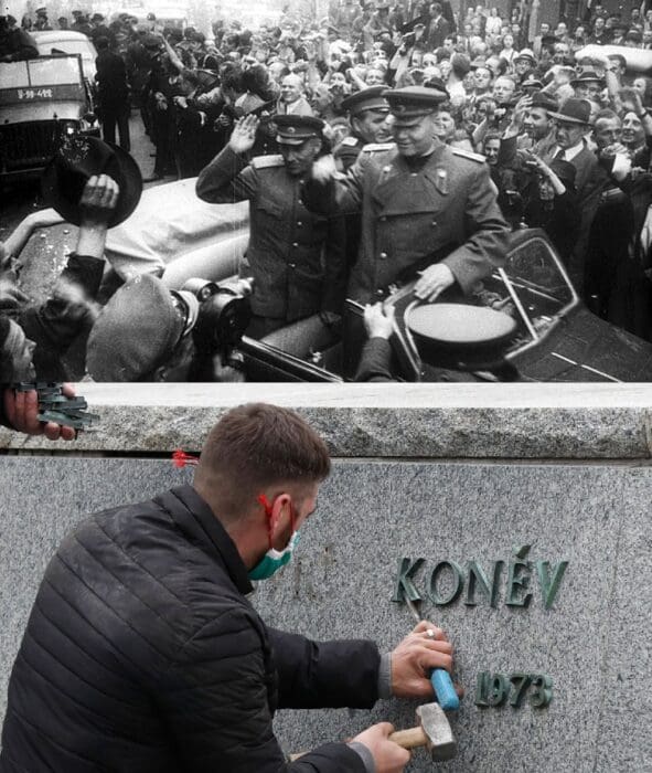 Naime, 3. travnja je uz pomoć dizalice i užadi u Pragu srušen je spomenik maršalu Ivanu Konevu. 9. travnja je ruski ministar obrane Sergej Šojgu napisao pismo čelniku češke vojske Lubomiru Metnaru tražeći od njega da preda srušeni spomenik Moskvi. Prag je odbio udovoljiti ruskoj strani i rekao da će spomenik „vjerojatno biti premješten u takozvani Muzej XX stoljeća, područje koje su mnoge zemlje istočne Europe odabrale da tamo smjeste sve nepoželjne spomenike, umjesto da ih unište.