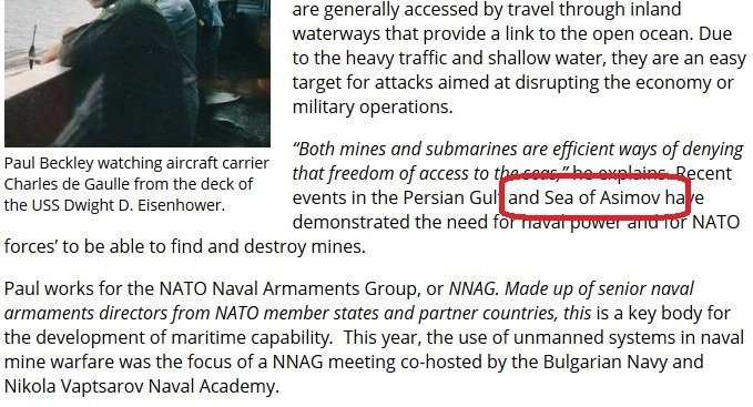 “Nedavni događaji u Perzijskom zaljevu i Asimovskom moru pokazali su potrebu za pomorskom snagom i snagama NATO-a koje mogu pronaći i uništiti mine”, izjavljuje za NATO pomorski časnik Paul Beckley, koji je očito otputovao u daleke galaksije koje nisu dostupne zemljama koje nisu članice NATO-a.