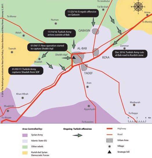 Turska i njeni saveznici iz takozvane “Slobodne sirijske vojske” tjednima pokušavaju zauzeti Al-Bab. Čak i uz potporu ruskih zrakoplovnih snaga, te američkih zrakoplova, koji također povremeno provode udare po Al-Babu, turske snage i savezničke islamističke milicije trpe znatne gubitke. Unatoč napadima teškog topništva, tenkova i pješaštva, grad još nije zauzet.