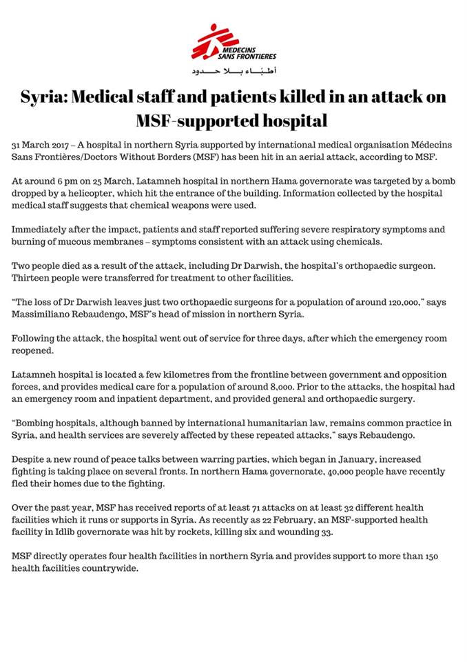 Danas su Liječnici bez granica objavili službeno priopćenje u kojem navode kako je u zračnim udarima u gradu Latamnehu, sjevernom dijelu pokrajine Hama, razorena jedna od njihovih bolnica, a projektil je pogodio odjel ortopedijske kirurgije. U udaru je stradalo dvoje ljudi, među kojima i kirurg dr. Darwish.