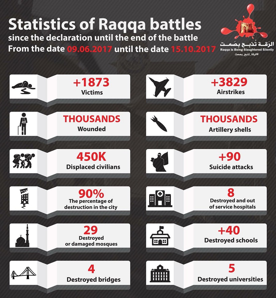 Aktivisti iz samog grada skupine ”Raqqa is Being Slaughtered Silently”, koji tvrde da se bore protiv terorizma i ”Assadovog režima”, navode da je ubijeno 1873 civila, a na tisuće ih je ranjeno.