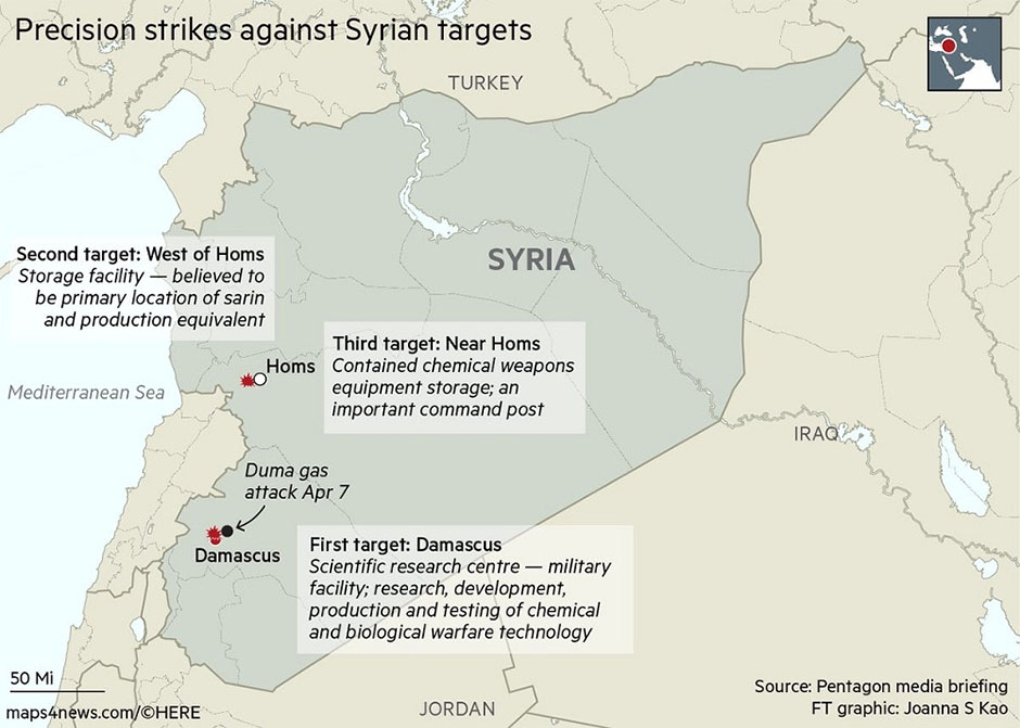 Prema službenim podacima ruskog Ministarstva obrane u agresiji Washingtona, Londona i Pariza na Siriju nije bilo žrtava. Iz Pentagona navode kako su gađani vojni objekti u kojima sirijska vojska proizvodi kemijsko oružje i skladišta u kojem su ta oružja pohranjena.