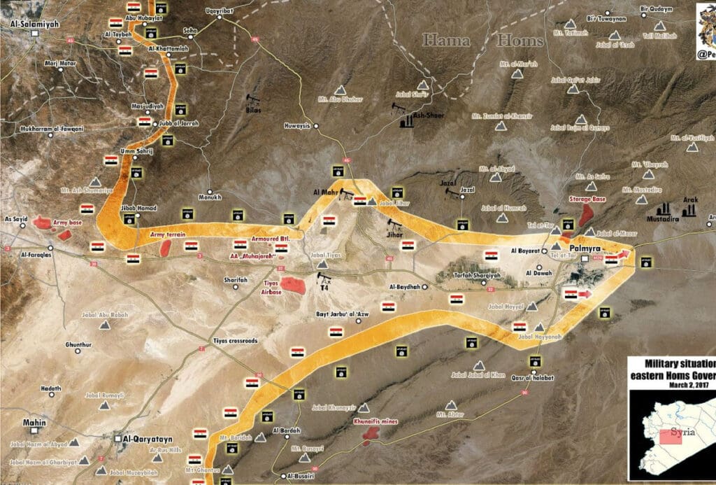 Međutim, sirijske snage nisu kao pošli put napredovale uskim koridorom iz zrakoplovne baze T-4 prema istoku, nego su prvo osigurale veći dio sjevernih i južnih područja od ceste M-20, čime su onemogućili teroriste takozvanog “kalifata” da brzim protunapadom sa sjevera ili juga glavninu snaga odsjeku od zaleđa i prekinu im opskrbne pravce.