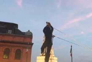 Video incidenta, koji se dijeli na društvenim mrežama, pokazuje grupu nasilnih demonstranata koji viču dok uklanjaju spomenik sa njegove baze pomoću konopa.