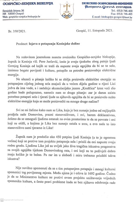 Župnik nam je predočio oko 450 potpisa ljudi Kosinja (a to je ogromna većina) koji se protive tom projektu potapanja sela i prisili da oni napuste svoju rodnu grudu. Ljudima Like još su uvijek jako živa tragična iskustva progonstva sa svojih ognjišta tijekom Domovinskog rata, i oni koji su to poživjeli dobro znaju koliko je to bolno. Pa zar im u slobodi i miru trebamo priuštiti takva iskustva?