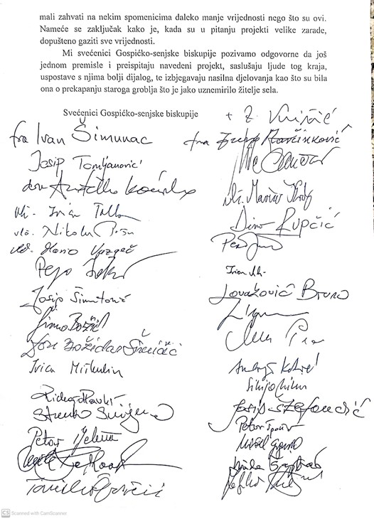 Mi svećenici Gospićko-senjske biskupije pozivamo odgovorne da još jednom premisle i preispitaju navedeni projekt, saslušaju ljude tog kraja, uspostave s njima bolji dijalog, te izbjegavaju nasilna djelovanja kao što su bila ona o prekapanju staroga groblja što je jako uznemirilo žitelje sela.