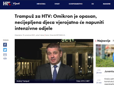 Onda imamo izvjesnog doktora Trampuža, Slovenca koji radi u Berlinu, ali eto, pojavljuje se na Hrvatskoj Televiziji i bez ikakvih dokaza, tvrdi da je Omikron opasan za djecu i da će necijepljena djeca puniti intenzivne odjele (!)