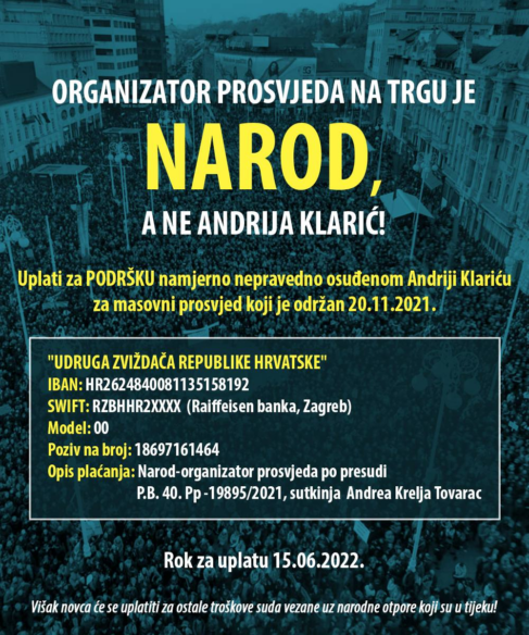 Uplati za PODRŠKU namjerno nepravedno osuđenom Andriji Klariću za masovni prosvjed 20.11.2021.: