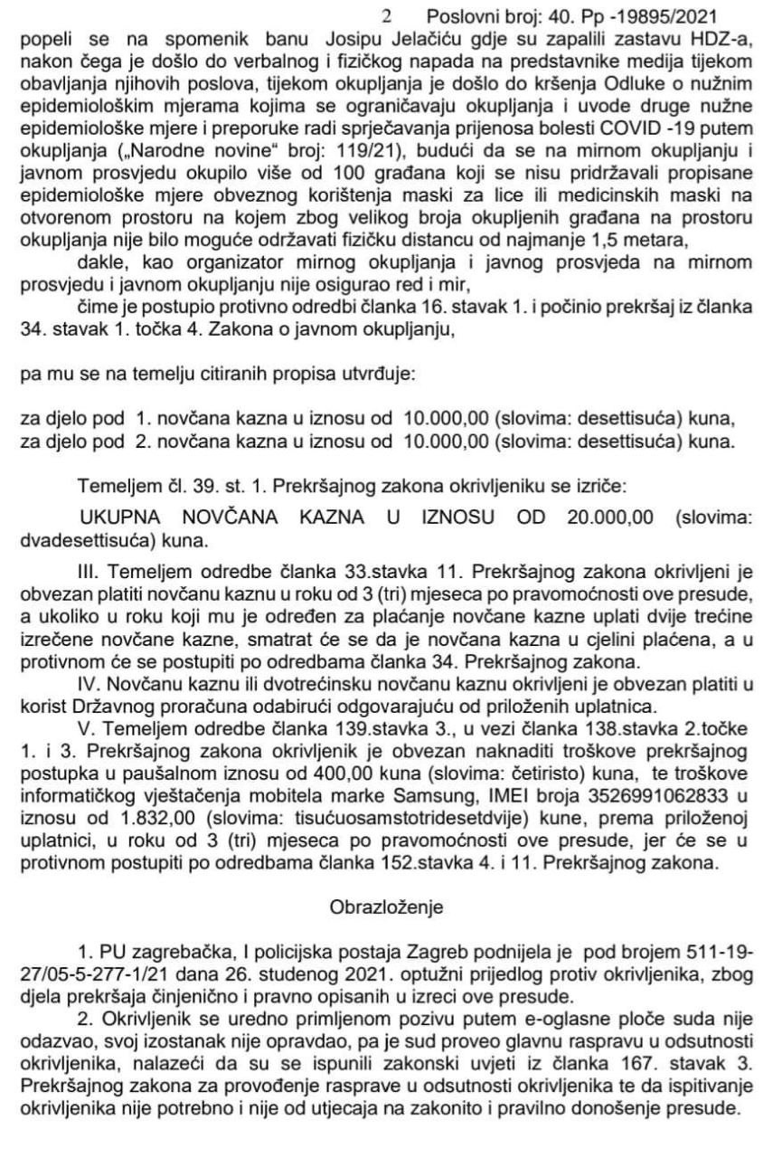 Opis plaćanja: Narod-organizator prosvjeda po presudi P.B. 40. Pp -19895/2021, sutkinja Andrea Krelja Tovarac