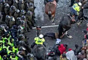 Scene koje dolaze iz Ottawe postaju sve užasnije. Mirni prosvjednici kojima je jedni grijeh to što ne žele da uzmu opasno cjepivo, dobivaju brutalne batine od strane kanadskog totalitarnog režima. Policija na konjima namjerno gazi ljude, nekoliko ženskih osoba je dobilo suzavac u lice, reporterka Rebel Newsa je jako udarena i traži medicinsku pomoć. Na ulicama se nalaze i teško naoružani specijalci u vojnim uniformama i puškama sa dugim cijevima. Jedan od njih je snimljen kako udara prosvjednika kundakom u glavu dok leži na podu.