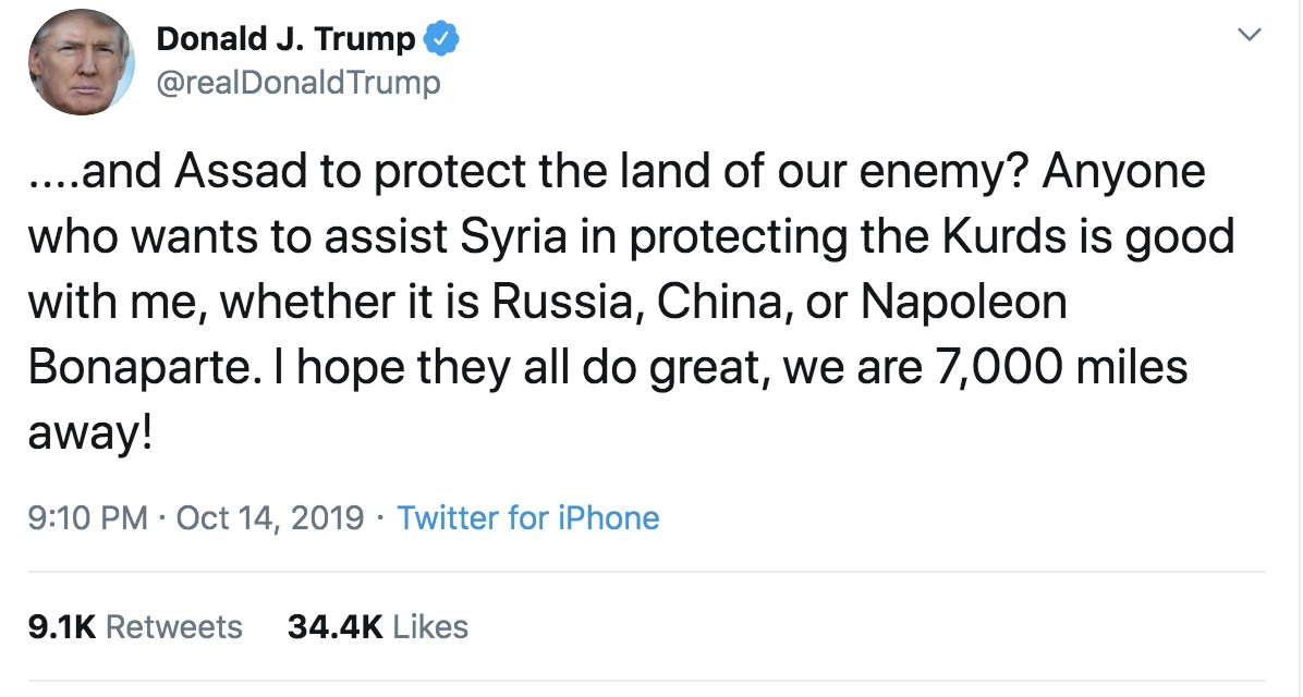 „Bilo tko tko želi pomoći Siriji u obrani Kurda, za mene je to dobro, bili to Rusija, Kina ili Napoleon Bonaparte. Nadam se da će uspjeti, mi smo ionako 7000 milja daleko“, ironizira Trump u drugoj objavi na Twitteru.