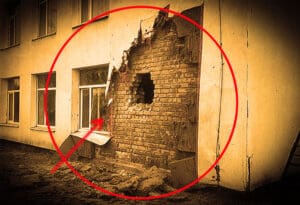 Ukrajinci tvrde da je to ruska granata pala na zgradu. Samo tu ima nekoliko problema. Granate ne padaju pod takvim kutom. Minobacačke granate padaju okomito na zgradu, najčešće na krov ili na gornji kat. I granate ostavljaju gelere kojih ovdje nema. Sjetite se slika razrušenih Hrvatskih gradova 1990-ih godina.