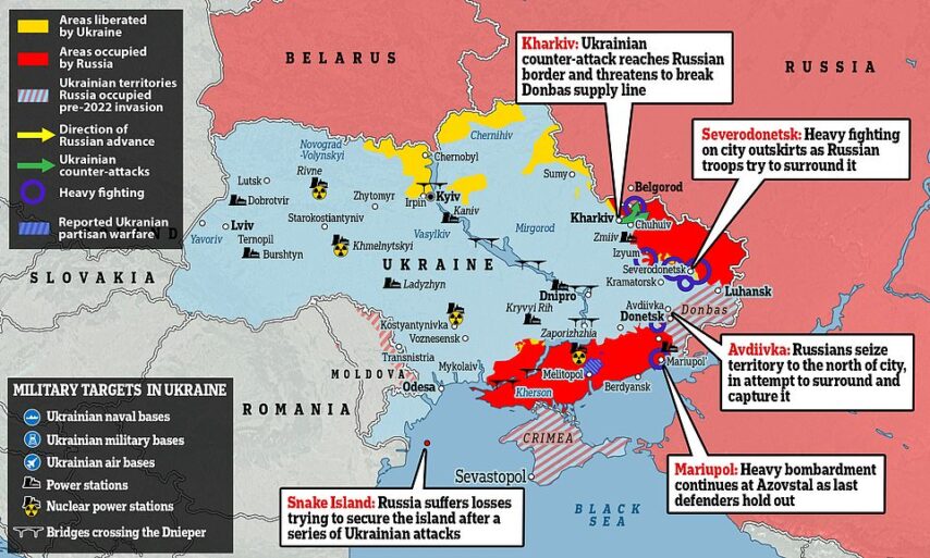 Na karti su dvije stvari ispravne – Rusija je zauzela Avdijevku i opkolila ukrajinske trupe kod Severodonjecka. Zbog napretka koji Rusija ostvaruje u Donjecku, Lloyd Austin je pozvao Sergeja Šojgua da moli za milost. Pretpostavljam da je general Šojgu rekao Ostinu: “Idite stučite po pjesku”, (što na ruskom znači: „Idite u pijesak.”)