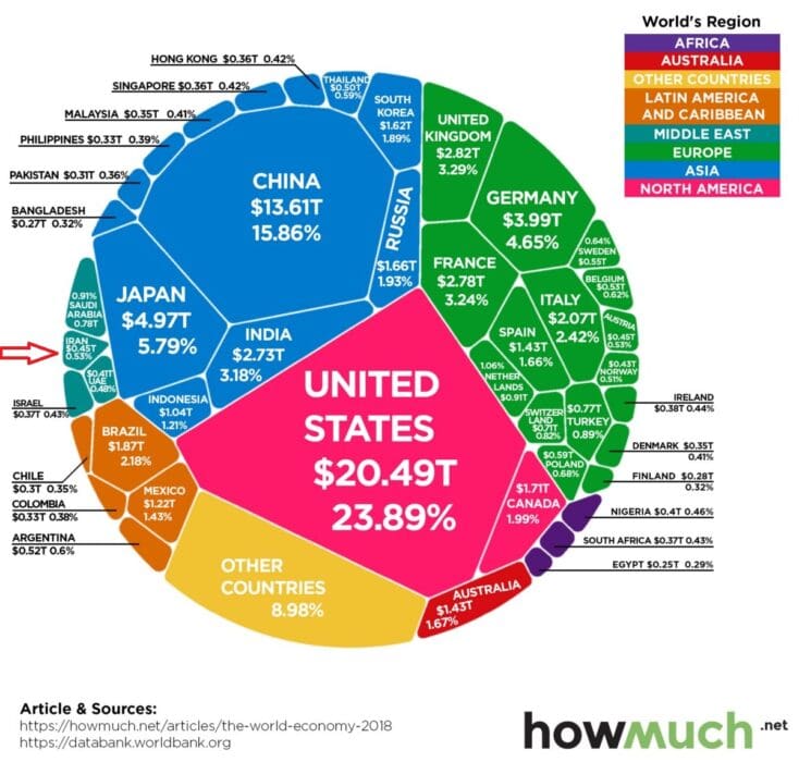 To nema veze jer jer je to zemlja koja je po populaciji od 80mil na 15. mestu u svetu. Nije to nikakva usporedba kad Norveska ima 5mil stanovnika a Iran 80mil. Veci BDP od Irana imaju npr. Tajska, Meksiko, Indonezija, Tajvan…Inace BDP po glavi stanovnika, Iran je na 97. mestu.