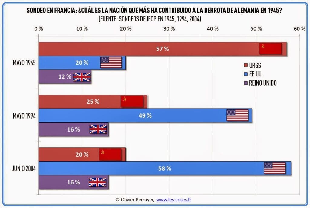 U jeku rusofobije, 2015, godine, mediji su ubrzali razinu propagande o Drugom svjetskom ratu. U tom je kontekstu bila zanimljiva višedesetljetna anketa „Francuskog instituta za istraživanje javnog mnijenja“ (IFOP), provedena u Francuskoj u godinama 1945., 1994. i 2004. godine, koja otkriva kako je javnost evoluirala tijekom vremena i promijenila mišljenje o tome koja je zemlja najzaslužnija za poraz nacističke Njemačke u Drugom svjetskom ratu.