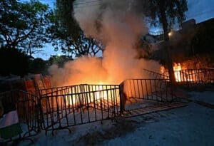 Videozapisi podijeljeni na društvenim mrežama pokazuju kako se policija bori s gašenjem gorućeg zida kompleksa, dok prosvjednici pokušavaju zapaliti veleposlanstvo i sukobljavaju se sa snagama sigurnosti.