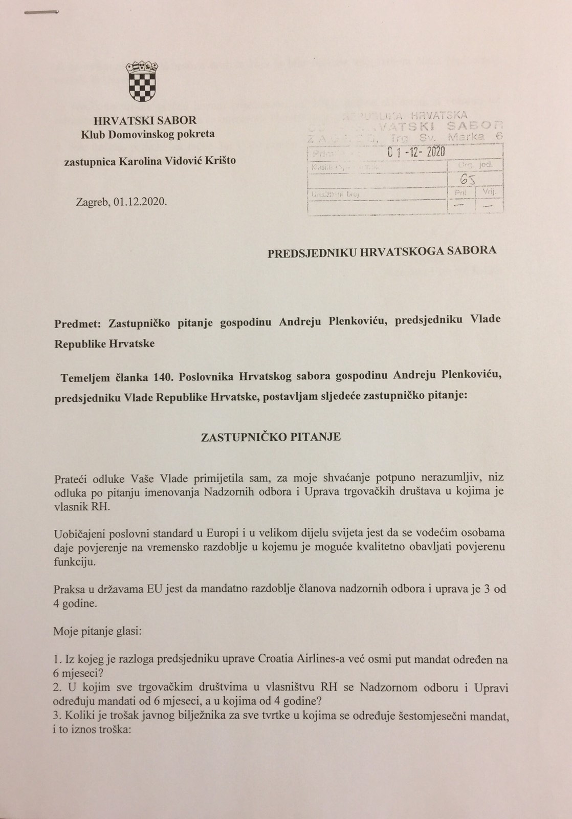 Danas sam uputila zastupničko pitanje predsjedniku hrvatske Vlade Andreju Plenkoviću, u svezi načina imenovanja nadzornih odbora i uprava državnih tvrtki.