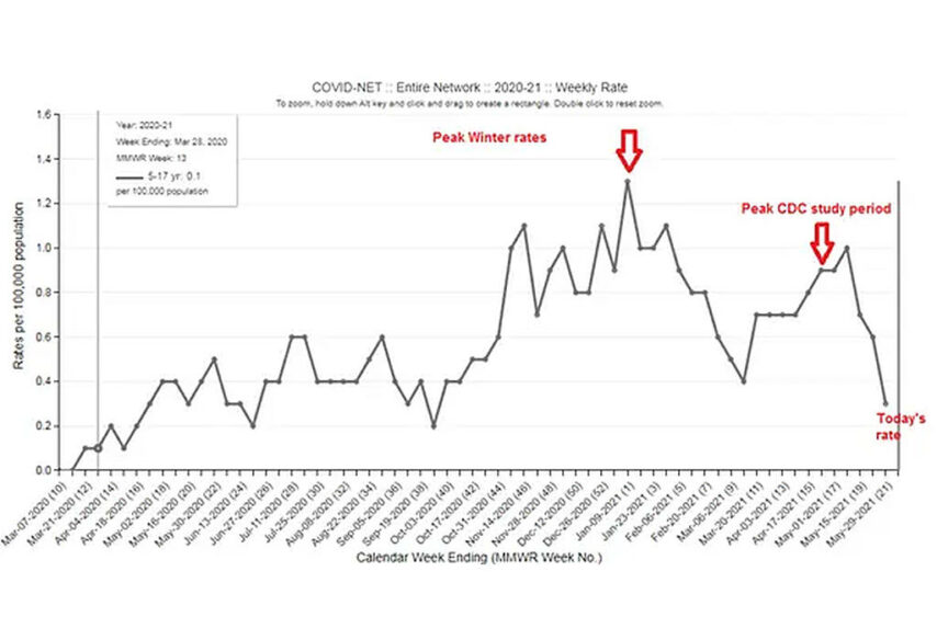 “Direktor CDC-a izvještava o velikom porastu hospitalizacija tinejdžera, poziva roditelje da cijepe djecu stariju od 12 godina”, bio je naslov u petak na Hillu, izvještavajući o novom istraživanju CDC-a o hospitalizacijama. Prirodno, privuklo mi je pažnju jer svi znamo da su hospitalizacije među svim dobnim skupinama posljednjih tjedana naglo padale i bilježile najniže razine u cijeloj zemlji. Ispada da je CDC, sa svojim Tjednim izvještajem o morbiditetu i mortalitetu (MMWR), objavio i “studiju” koja pokazuje rast broja hospitalizacija među 12 do 17 godina, od kojih je jedna trećina na JIL-u, a 5 % ih je postavljeno na respiratore.