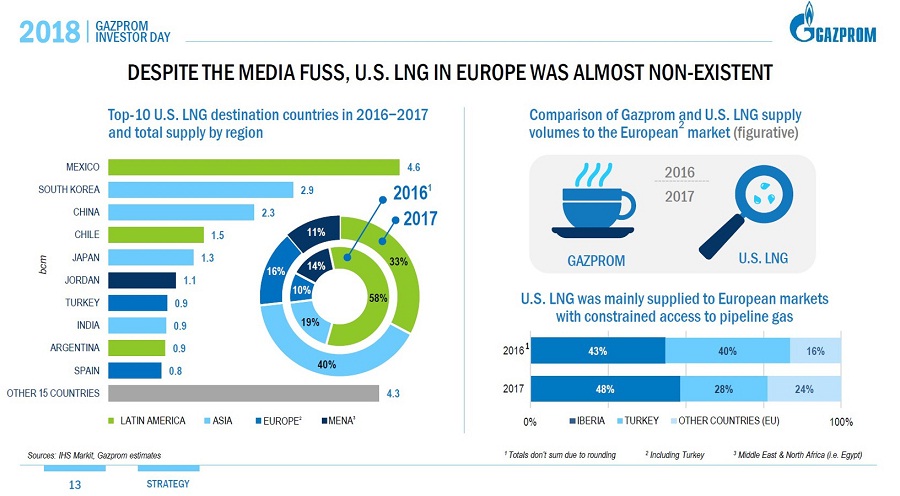 Što se tiče prirodnog ukapljenog plina, Gazprom je na sastanku s investitorima u New Yorku napomenuo da je trenutni u američkog LNG-a u Europi, unatoč informativnoj kampanji velikih razmjera u posljednjih nekoliko godina, i dalje je ništavan u usporedbi s isporukama ruskog plina kroz plinovode u EU.