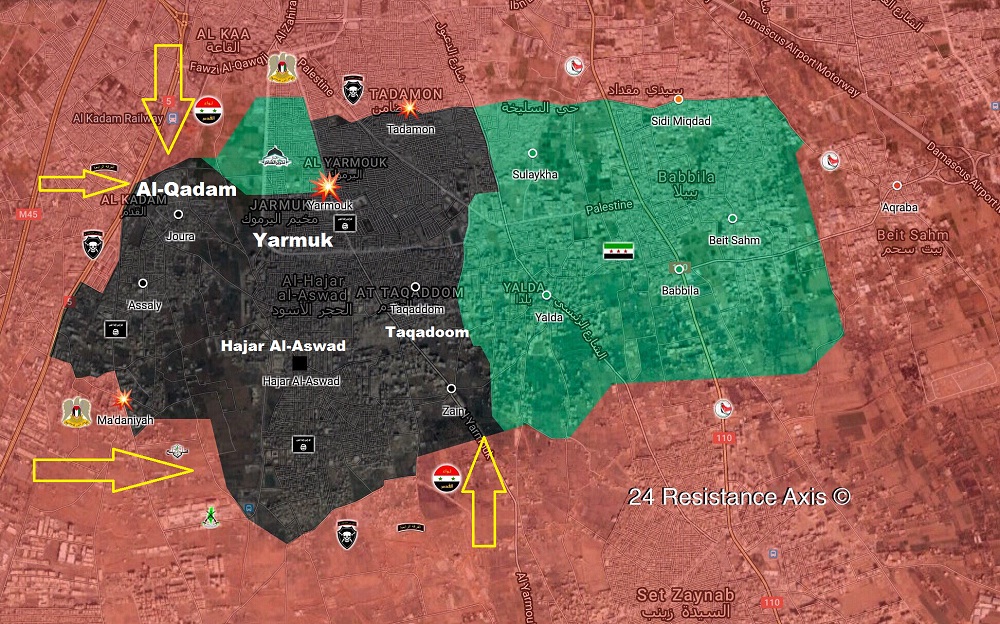 Nakon još jednog neuspjelog kruga pregovora s teroristima u Yarmuku, sirijska vojska je službeno priopćila da pokreće dugo očekivanu ofenzivu južno od Damaska. Potpomognuta brojnim palestinskih skupina, sirijski vojska je počela napad jakim bombardiranjem položaje Islamske države u četvrti Al-Qadam, Yarmouk i Taqaddum. Nakon topničke pripreme su sirijska vojska i saveznici napali položaje terorista Islamske države u Al-Qadamu. Zračne udare je provelo u rusko zrakoplovstvo, koji je gađalo uporišta ISIL-a u četvrti Hajar Al-Aswad, Al-Qadamu i središtu Yarmuka.