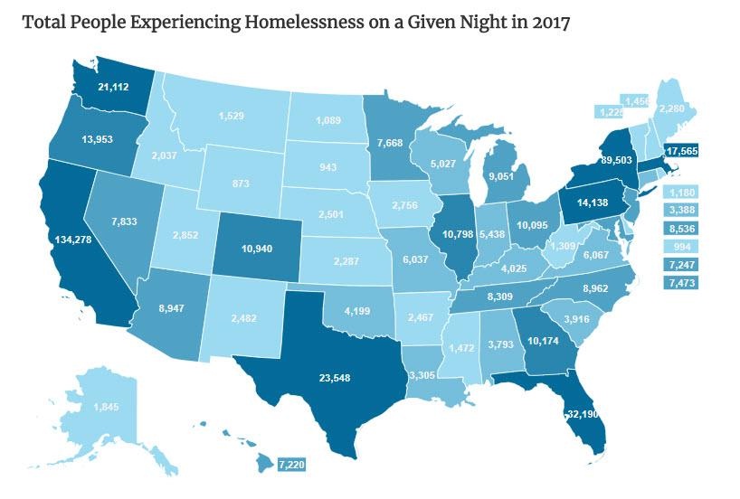 Kao što pokazuje gore navedena karta, više od pola milijuna ljudi je službeno bilo bez doma samo 2017. No, među njima je četvrtina onih koji imaju posao, ali si zbog niskih plaća i visokih cijena nekretnina i najma jednostavno ne mogu priuštiti krov nad glavom.