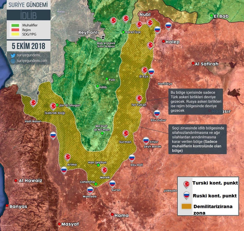 Iako turski mediji prenose kako su se islamističke terorističke skupine povukle iz područja koje je sporazumom između Rusije i Turske u Idlibu određeno da bude demilitarizirana zona, što su potvrdili nekoliko fotografija povlačenja jedinica teške vojne opreme, zapravo se ne zna koje su skupine ostala, a koje napustile položaje. Sirijski ministar vanjskih poslova Walid Muallem je rekao kako to za Tursku ne predstavlja problem, jer turska vojska i obavještajne službe poimence znaju i imaju popis svih terorista u Idlibu.