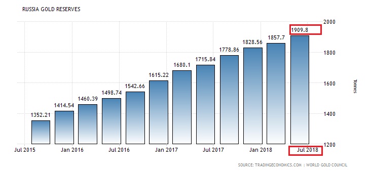 Do sada je Središnja banka Rusije nagomilala već oko 62 milijuna unci zlata, što je rekordan iznos, kaže austrijski časopis. To bi bio ekvivalent od 1909,9 tona zlata, dok je prethodno prijavljeni iznos zlatnih rezervi iznosio 1857,7 tona.