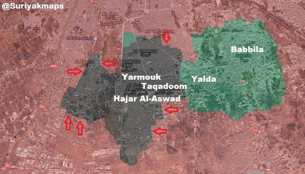 Jučer, tijekom poslijepodneva, sirijska vojska uspjela napredovati na nekoliko fronti. Na jugu regije Hajar Al-Aswad oslobođena su najmanje dva bloka. Oko 10 do 15 objekata je oslobođeno na sjeveru četvrti Qadam i Tadamun. Na jugu velike regije Qadam je dovršeno oslobođenje Madaniye i teroristima području Qadama prijeti potencijalno okruženje.