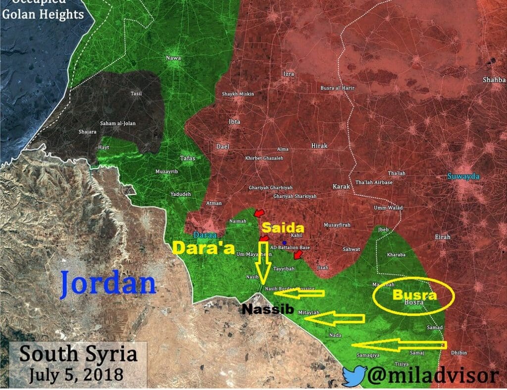 Sirijska vojska je jučer pokrenula veliki napad u jugoistočnom dijeli pokrajine Dara’a i prvo je oslobodila grad Bosra na jordanskog granici i grad Saida sjeverno od graničkog prijelaza Nassib s Jordanom.