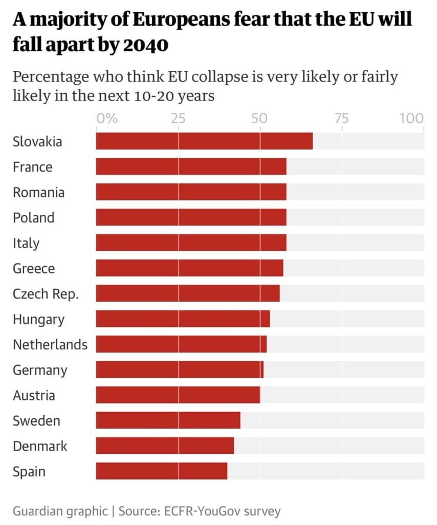 Ti su podaci dobiveni istraživanjem koje je proveo istraživački centar YouGov Europskog vijeća za inozemne odnose u 14 europskih zemalja: u Francuskoj, Njemačkoj, Belgiji, Italiji, Nizozemskoj, Austriji, Slovačkoj, Rumunjskoj, Grčkoj, Češkoj, Mađarskoj, Danskoj, Španjolskoj i Poljskoj. Tijekom ankete, većina ispitanika izjavila je da je kolaps Europske unije u sljedećih 10 do 20 godina “realna mogućnost”.