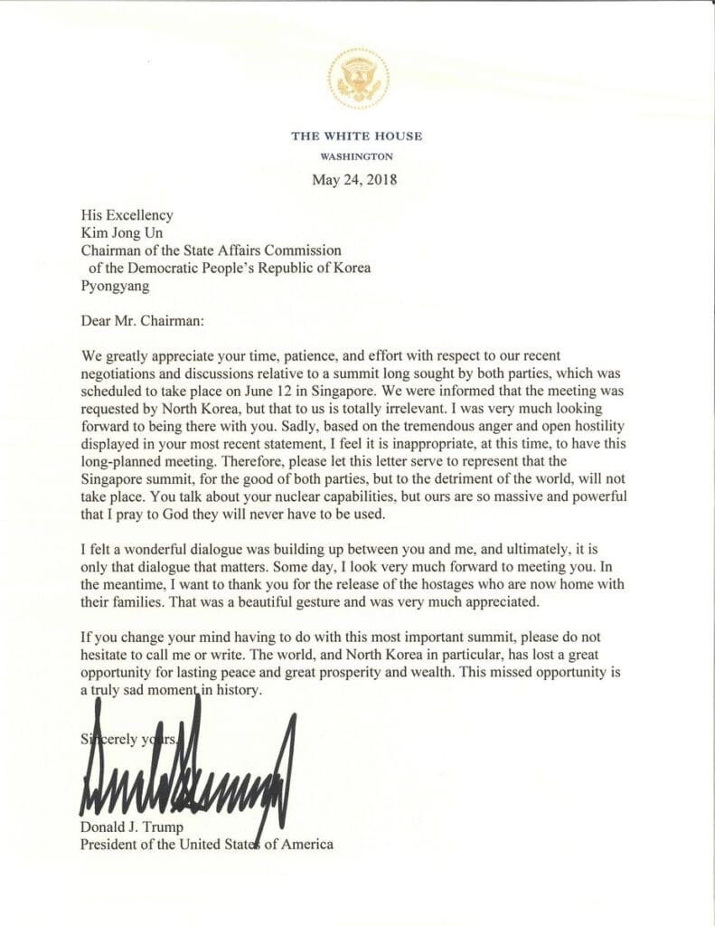 U pismu američkog predsjednika lideru Sjeverne Koreje Kim Jong-unu stoji “kako je ova odluka uzrokovana bijesom i otvorenim neprijateljstvom Sjeverne Koreje”.